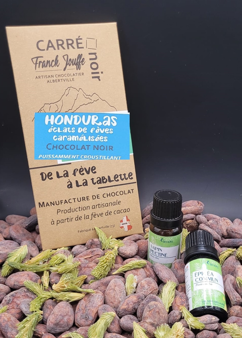 Un chocolat boisé et rafraîchissant, où la profondeur du cacao rencontre la vivacité du sapin.